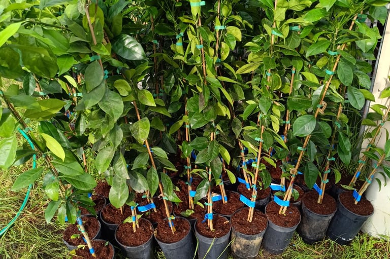 Tous nos plants d'agrumes sont produits par des pépinières spécialisées, garantissant une qualité irréprochable. Nous sélectionnons avec soin chaque plant pour vous assurer des produits sains et vigoureux. Que vous recherchiez de jeunes plants pour démarrer votre plantation ou des arbres déjà établis, nous avons ce qu'il vous faut.